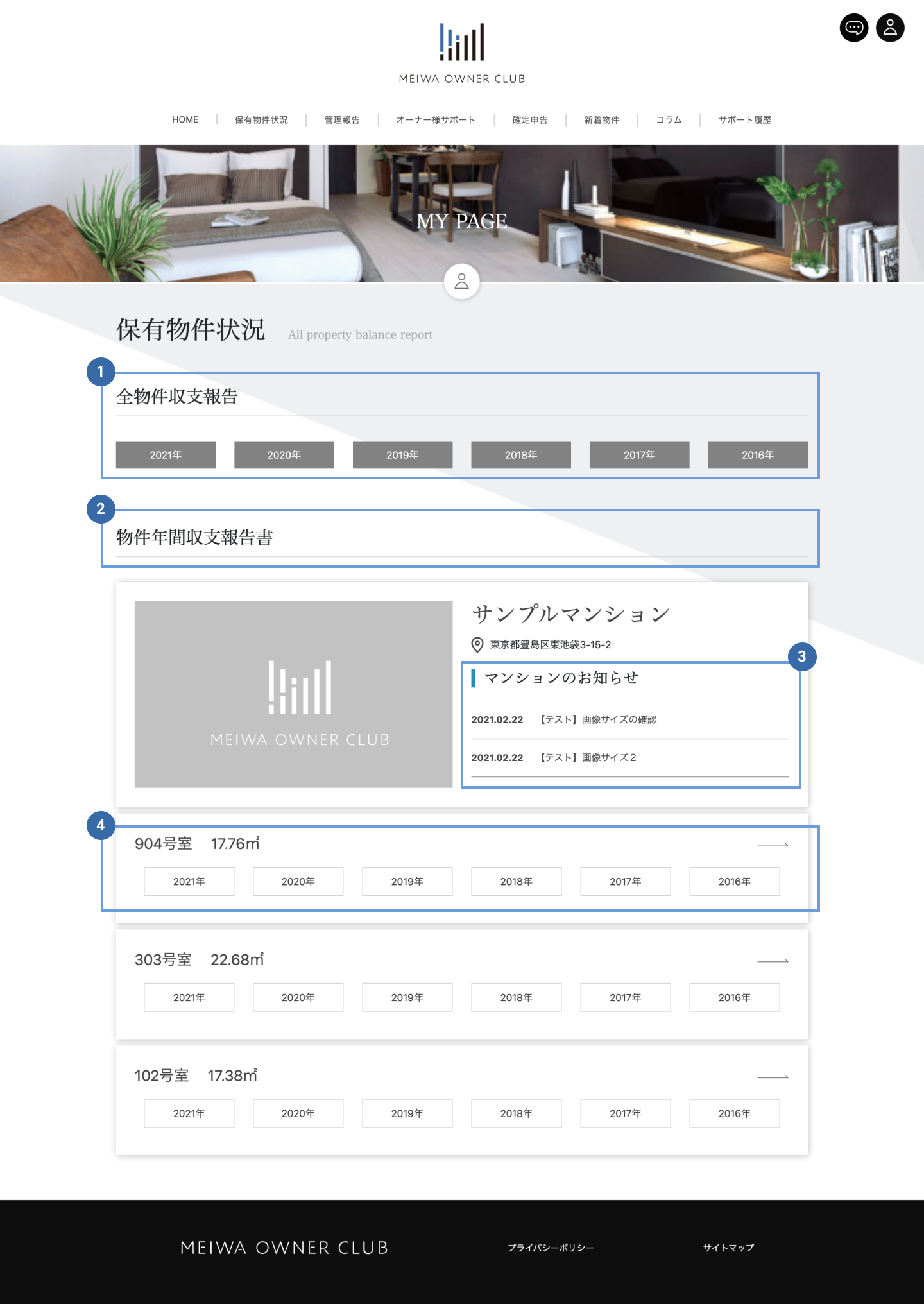 保有物件状況では所有の物件の年間収支と、複数お持ちの場合は総合計の収支を確認することができます。