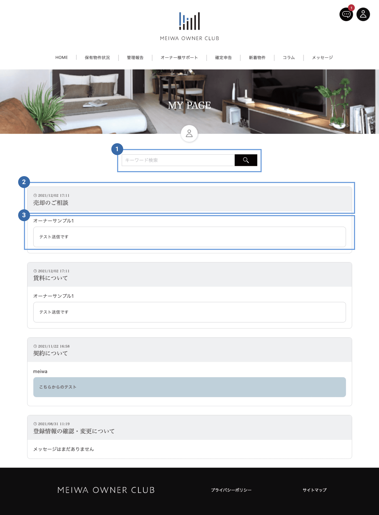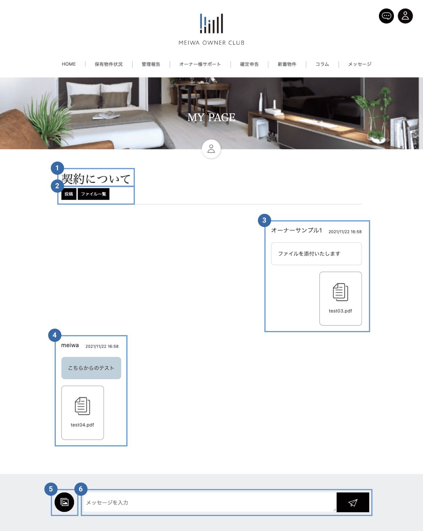 最新のメッセージが表示されます。白はオーナー様、ブルーは明和側の内容となります。